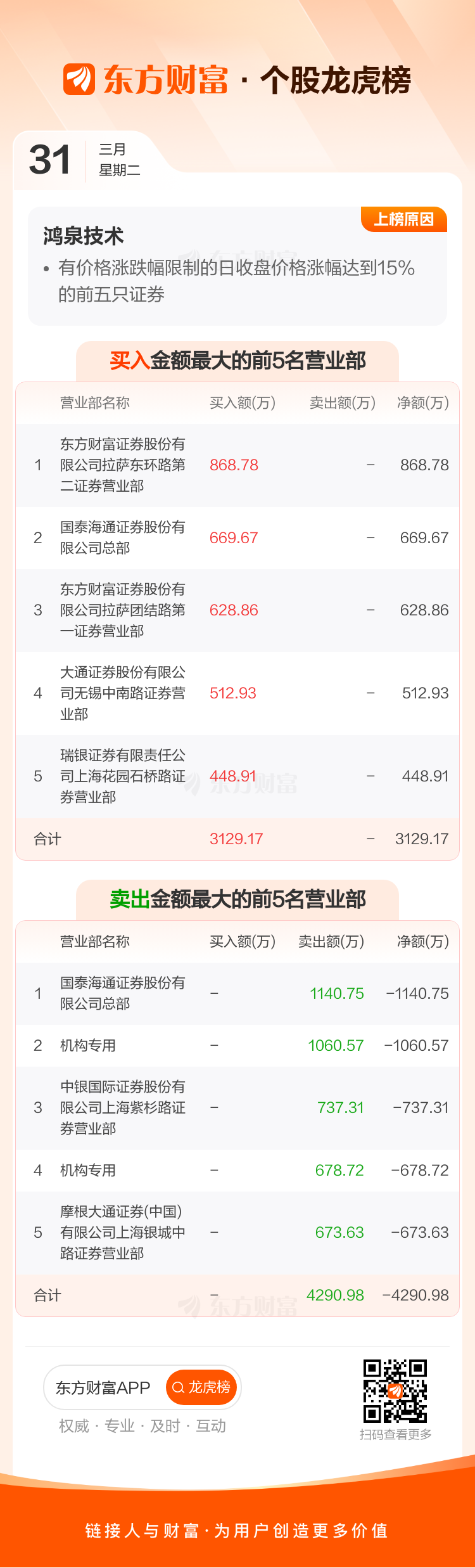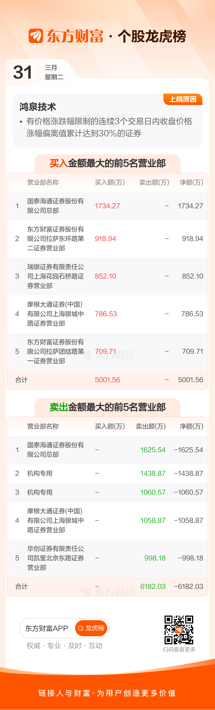 交易所2026年3月31日公布的交易公开信息显示,鸿泉技术因成为有价格涨跌幅限制的日收盘价格涨幅达到15%的前五只证券、有价格涨跌幅限制的连续3个交易日内收盘价格涨幅偏离值累计达到30%的证券上榜。鸿泉技术当日收报30.6元,涨跌幅16.26%,偏离值16.26%,换手率14.33%,成交额4.10亿。异常期间3月30日至3月31日,期间涨幅28.73%,累计偏离值32.15%,区间成交额6.10亿。