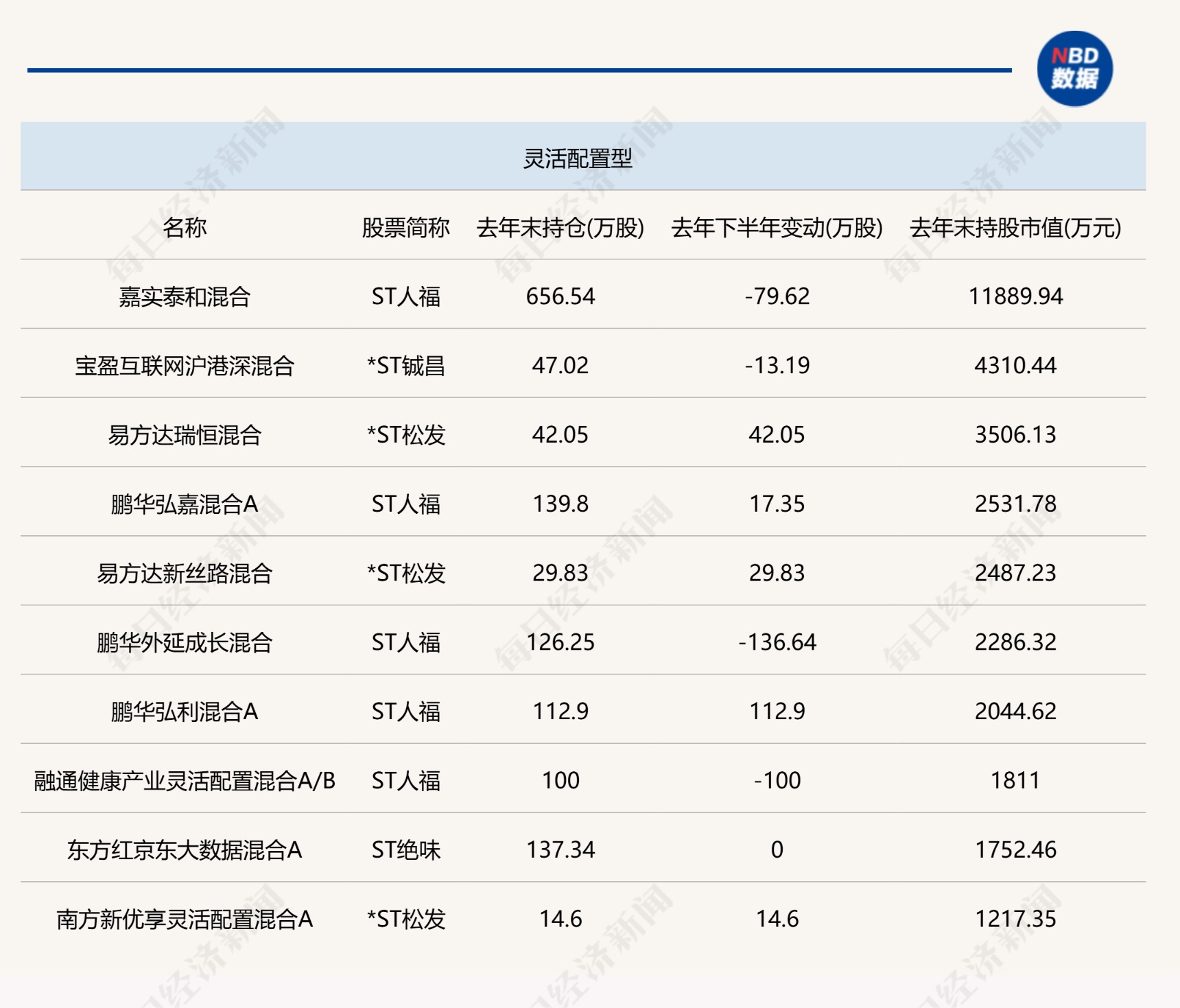当然,也有基金在配置多个ST个股的同时,去年四季度对部分持仓进行了削减。例如,鹏华优势企业去年年底统计时,配置了ST八菱和ST人福,但后者的持股数量较去年年中已有大幅缩减。类似的情况还有博时丝路主题配置的*ST松发,去年年底持仓仅剩0.43万股,相较去年年中时几乎是清仓式减持。