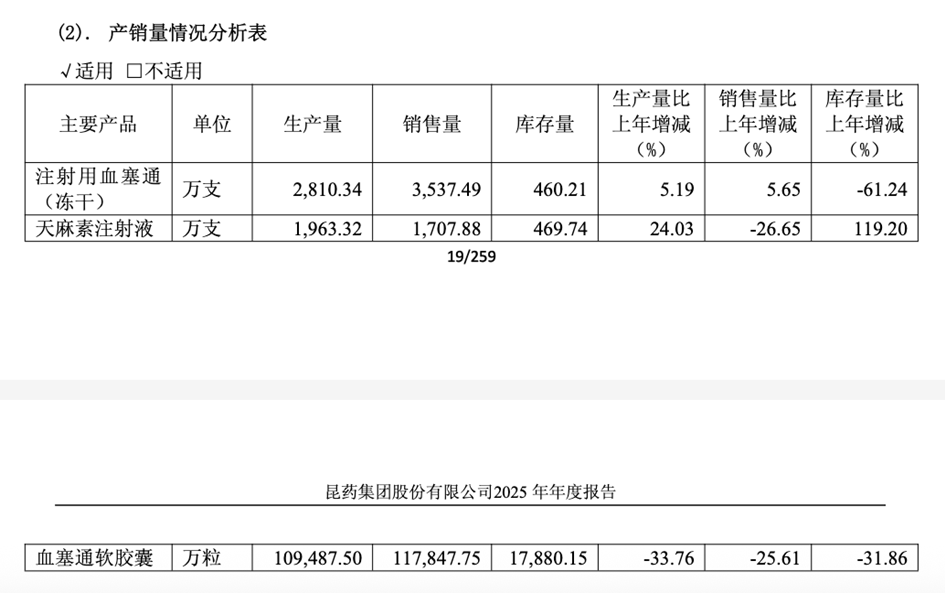 核心产品的销售数据同样不容乐观。作为公司王牌产品的血塞通软胶囊,2025年销量10.95亿粒,同比下降25.61%,受药店处方管控、慢病病种限制影响显著;天麻素注射液销量1707.88万支,同比减少26.65%,但生产量却增加24.03%,导致期末库存同比激增119.20%,产销失衡问题突出。唯一亮点是注射用血塞通(冻干)凭借集采中标优势实现销量增长5.65%,库存下降61.24%,但单品体量有限,无法扭转整体颓势。