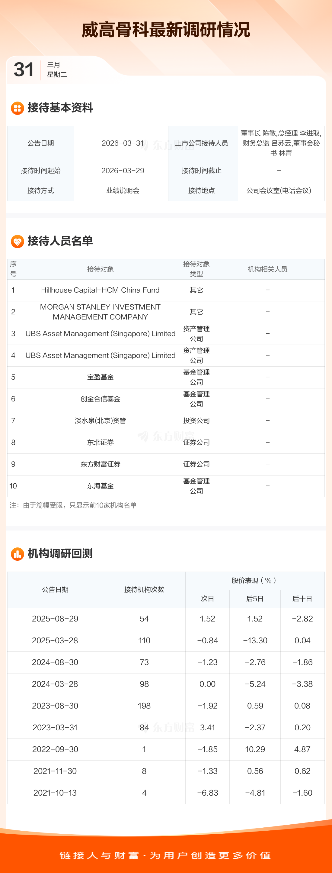 威高骨科3月31日公告称,3月29日接待Hillhouse Capital-HCM China Fund等77家机构调研。接待人员包括董事长 陈敏,总经理 李进取,财务总监 吕苏云,董事会秘书 林青。