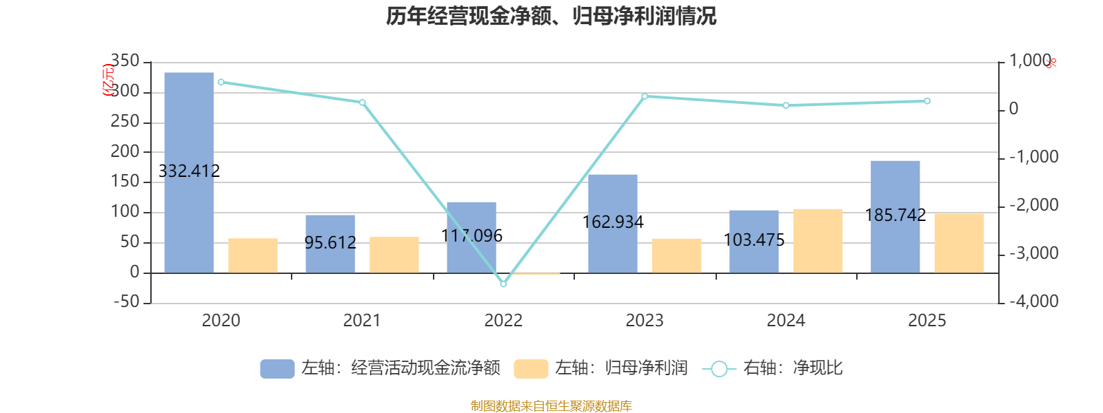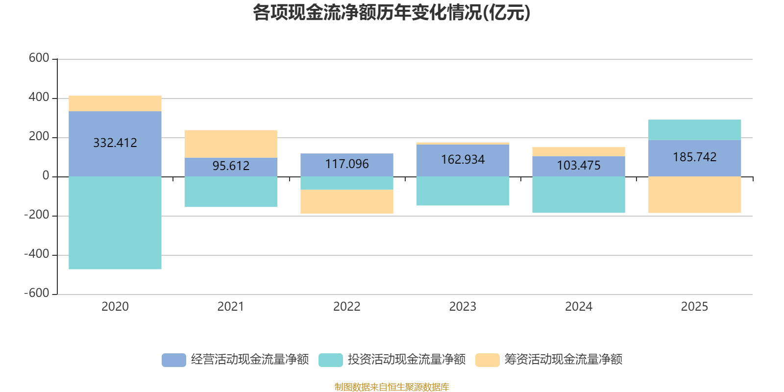 2025年,公司经营活动现金流净额为185.74亿元,同比增长79.51%;筹资活动现金流净额-185.98亿元,同比减少232.14亿元;投资活动现金流净额103.91亿元,上年同期为-185.58亿元。