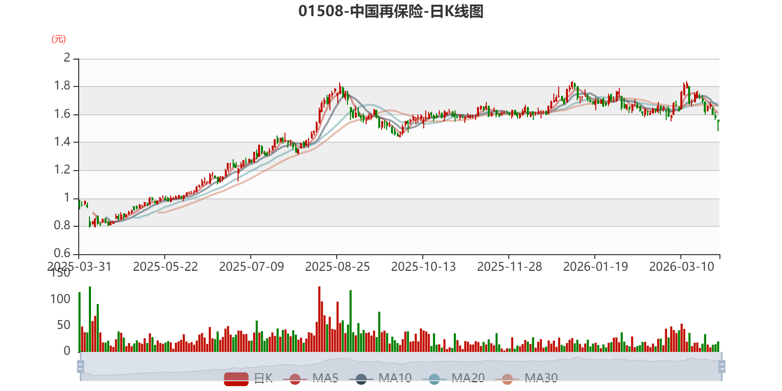 以3月30日收盘价计算,中国再保险目前市盈率(TTM)约6.09倍,市净率(TTM)约0.56倍,市销率(TTM)约0.48倍。