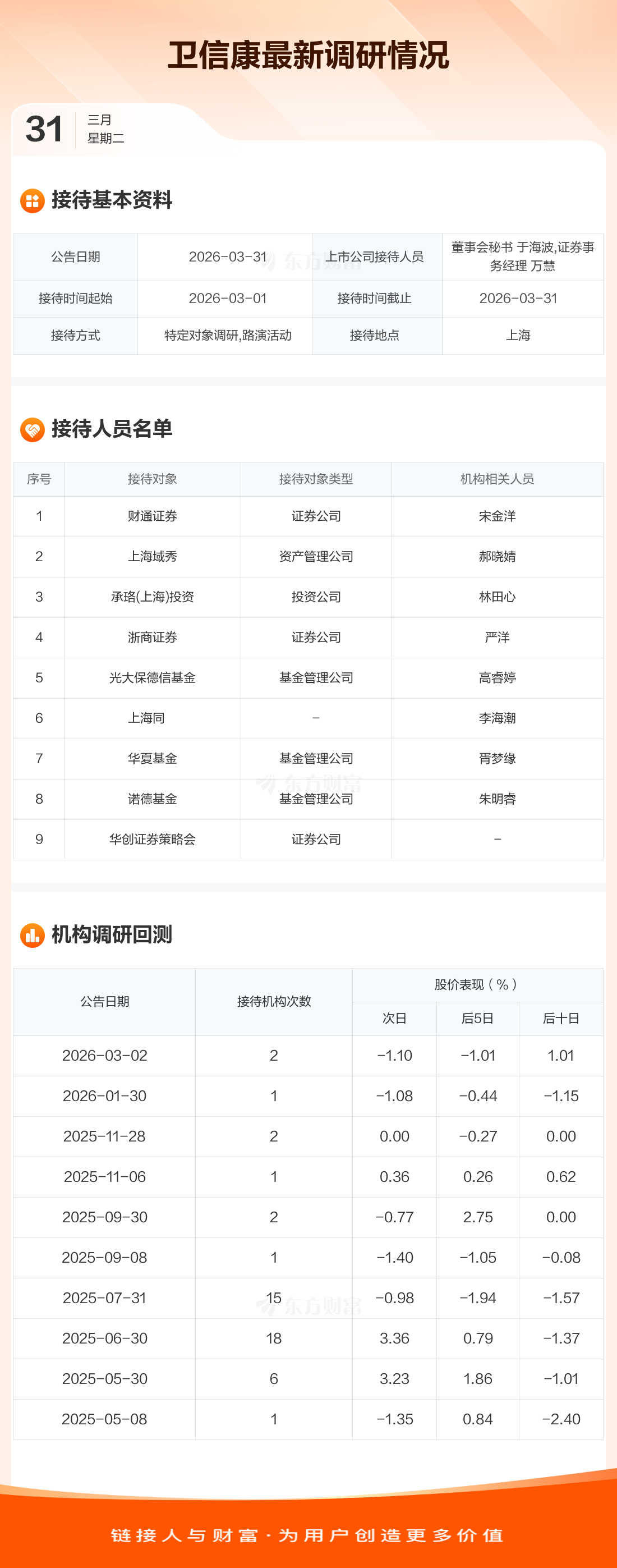 卫信康3月31日公告称,3月1日至3月31日接待财通证券等9家机构调研。接待人员包括董事会秘书 于海波,证券事务经理 万慧。
