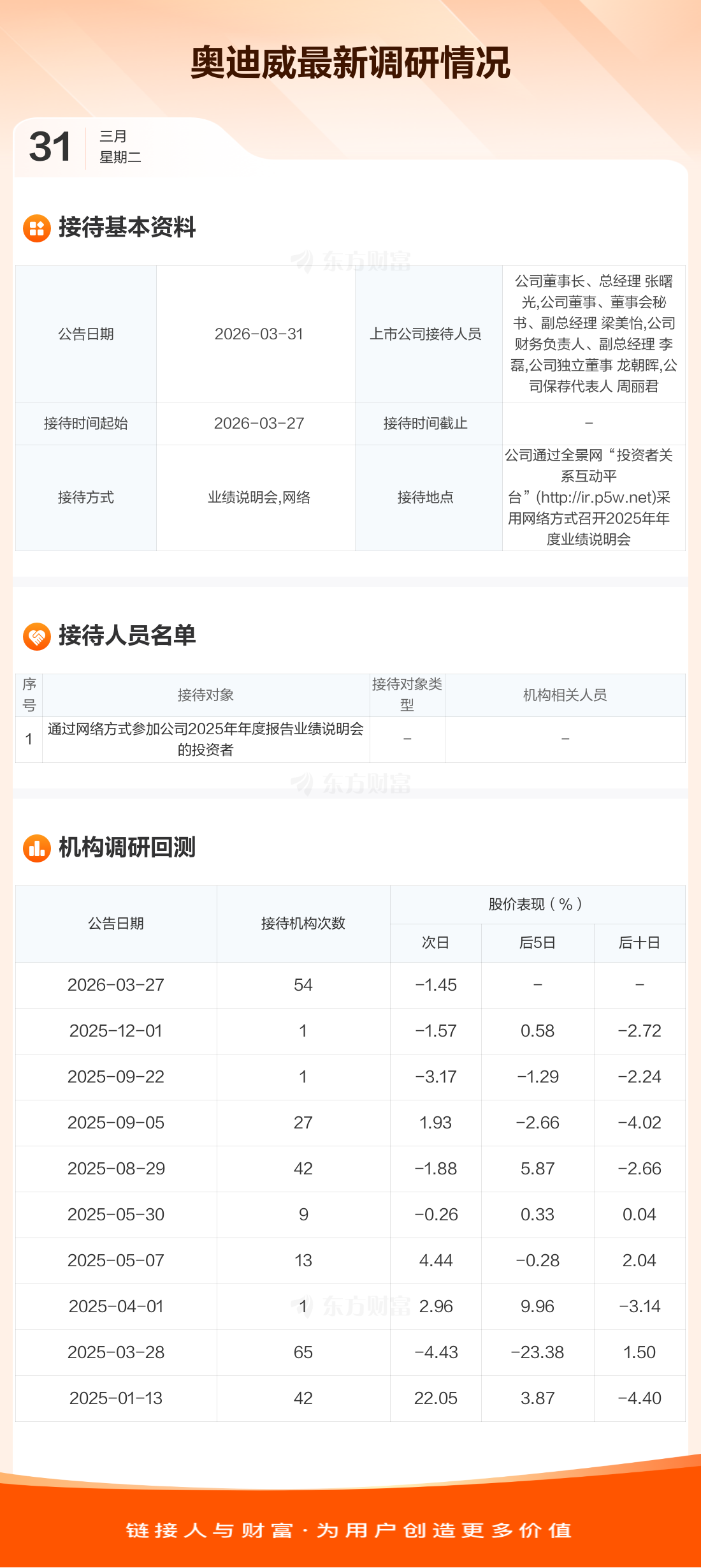 奥迪威3月31日公告称,3月27日接待通过网络方式参加公司2025年年度报告业绩说明会的投资者等1家机构调研。接待人员包括公司董事长、总经理 张曙光,公司董事、董事会秘书、副总经理 梁美怡,公司财务负责人、副总经理 李磊,公司独立董事 龙朝晖,公司保荐代表人 周丽君。