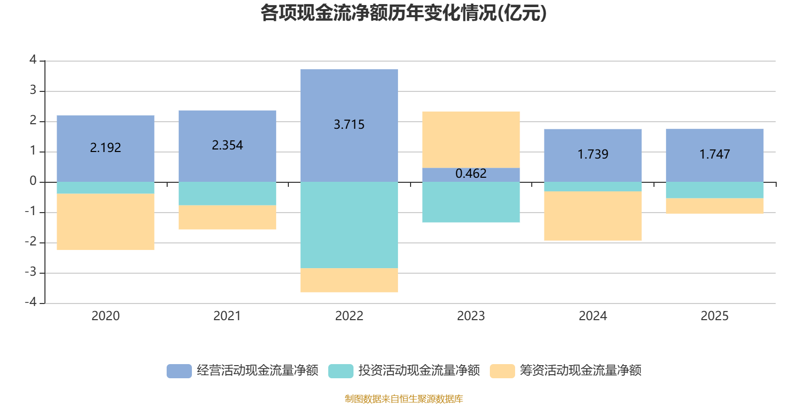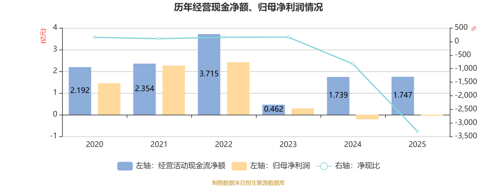 2025年,公司经营活动现金流净额为1.75亿元,同比增长0.45%;筹资活动现金流净额-5068.4万元,同比增加1.12亿元;投资活动现金流净额-5448.2万元,上年同期为-3160.2万元。