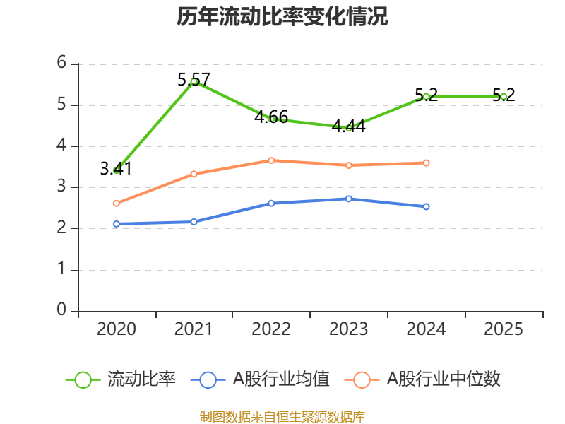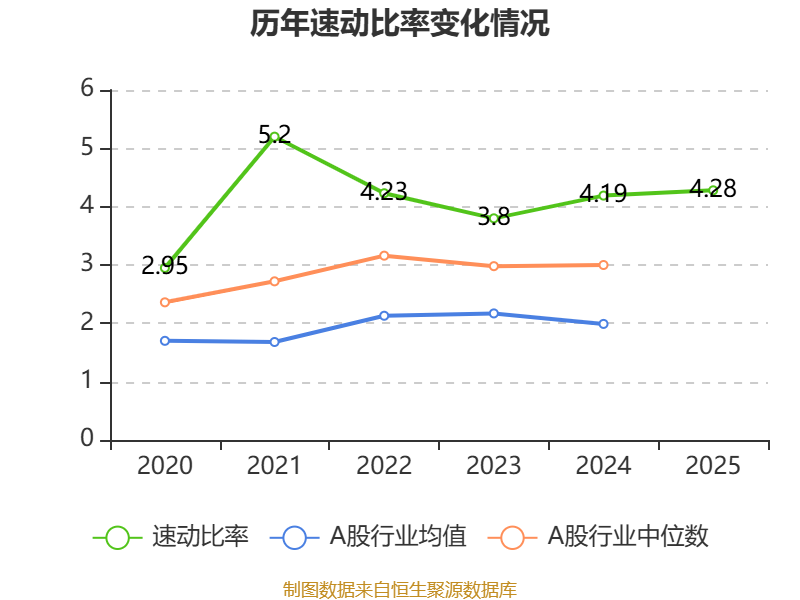 2025年,公司流动比率为5.20,速动比率为4.28。