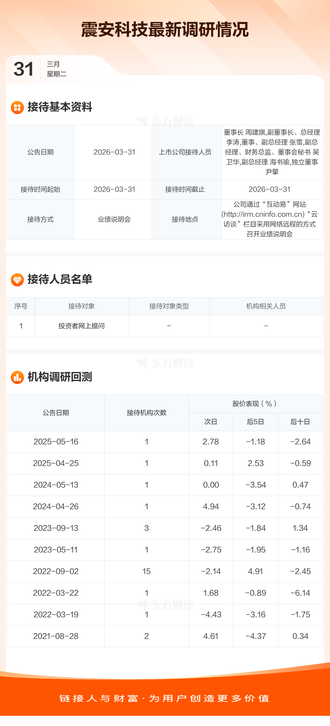 震安科技3月31日公告称,3月31日接待投资者网上提问等1家机构调研。接待人员包括董事长 周建旗,副董事长、总经理 李涛,董事、副总经理 张雪,副总经理、财务总监、董事会秘书 吴卫华,副总经理 海书瑜,独立董事 尹擎。
