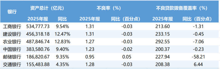 分业务看,2025年,银行净息差依旧承压,但多家国有行利息净收入降幅缩窄,且手续费及佣金净收入增速全部由负转正。其中,农业银行、邮储银行手续费及佣金净收入增速均超16%。资产方面,2025年,有5家国有行总资产同比增长超9%,其中工商银行总资产率先突破50万亿元,而交通银行增速(4.35%)相对靠后,年末六大国有行不良贷款率、拨备覆盖率均呈现“五降一升”。