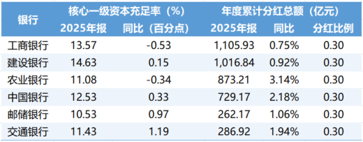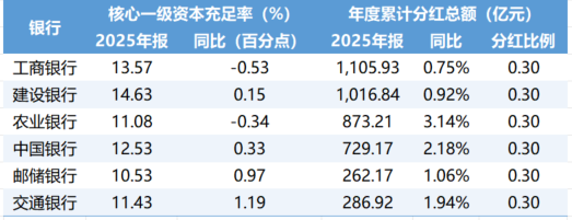 对于投资者普遍关心的分红问题,六大国有行均在财报中披露了2025年度利润分配方案。含中期分红在内,六大国有行均维持约30%较高的现金分红比例,年度拟合计分红4274.23亿元。其中,工商银行、建设银行、农业银行、中国银行、邮储银行、交通银行分别拟年度分红1105.93亿元、1016.84亿元、873.21亿元、729.17亿元、262.17亿元、286.92亿元。