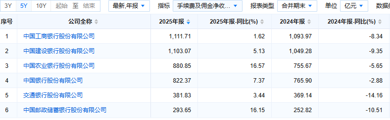 随着收入回暖,中间业务对六大国有行收入贡献度有所回升。2025年,工商银行、建设银行、农业银行、中国银行、交通银行的手续费及佣金净收入占营收比例均超12%,其中建设银行占比最高,达14.49%;仅邮储银行不及10%,为8.25%。