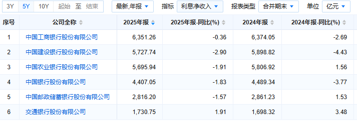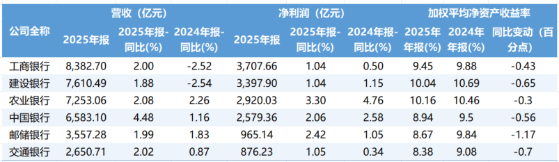 财务数据显示,2025年,六大国有行营收合计3.60万亿元,同比增长2.3%,排位并没有新变化,工商银行以8382.70亿元继续领跑,建设银行、农业银行、中国银行、邮储银行、交通银行依次跟随;且营收均实现正增长,增速在1.88%-4.48%之间。其中,中国银行营收增速最高,达4.48%,工商银行、建设银行营收增速由上一年负增长回正,增幅分别为2.00%、1.88%。