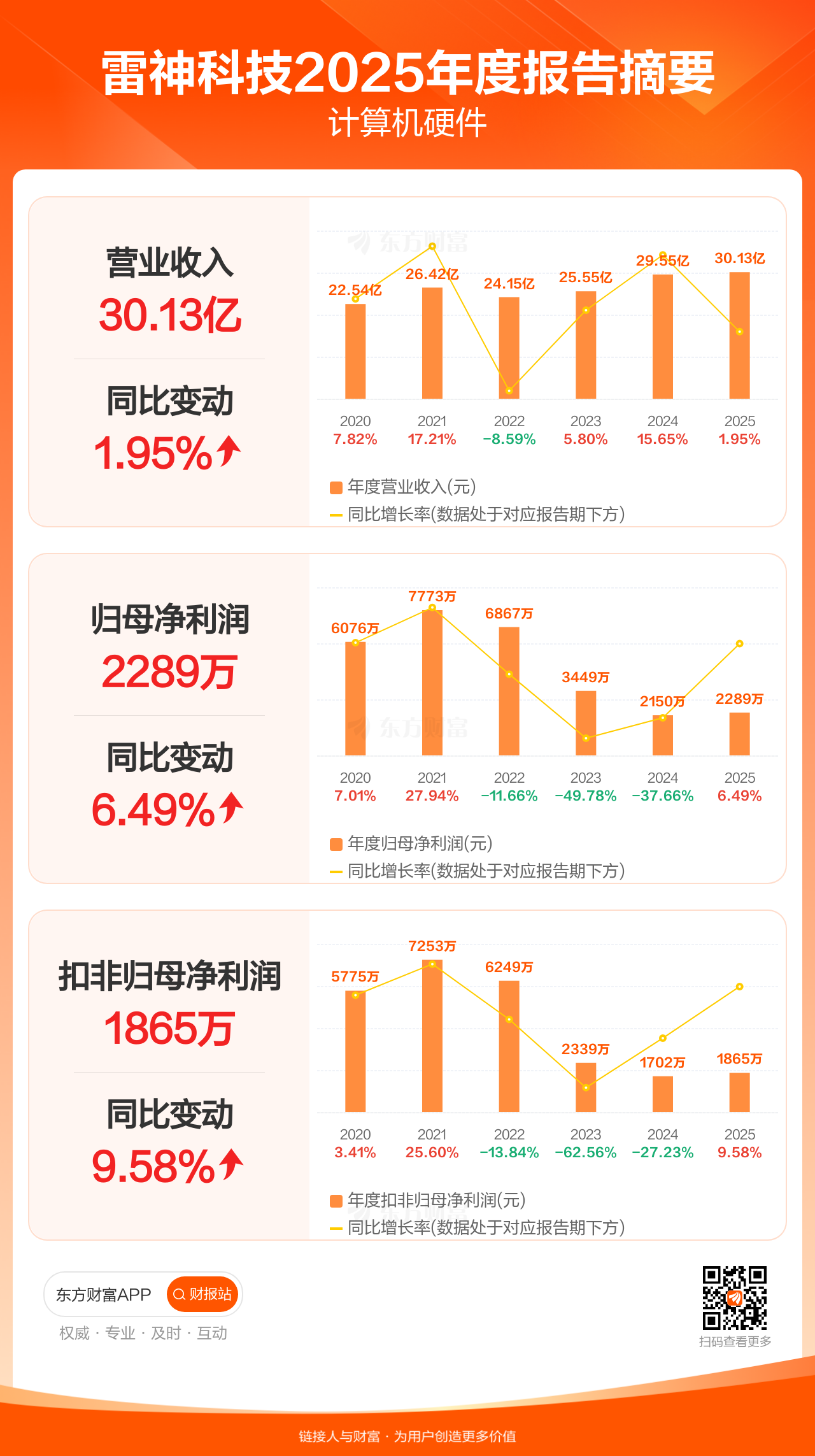 雷神科技3月31日发布2025年年报显示,公司全年实现营业收入30.13亿元,同比增长1.95%;归母净利润2289.43万元,同比增长6.49%;扣非归母净利润1865.40万元,同比增长9.58%。