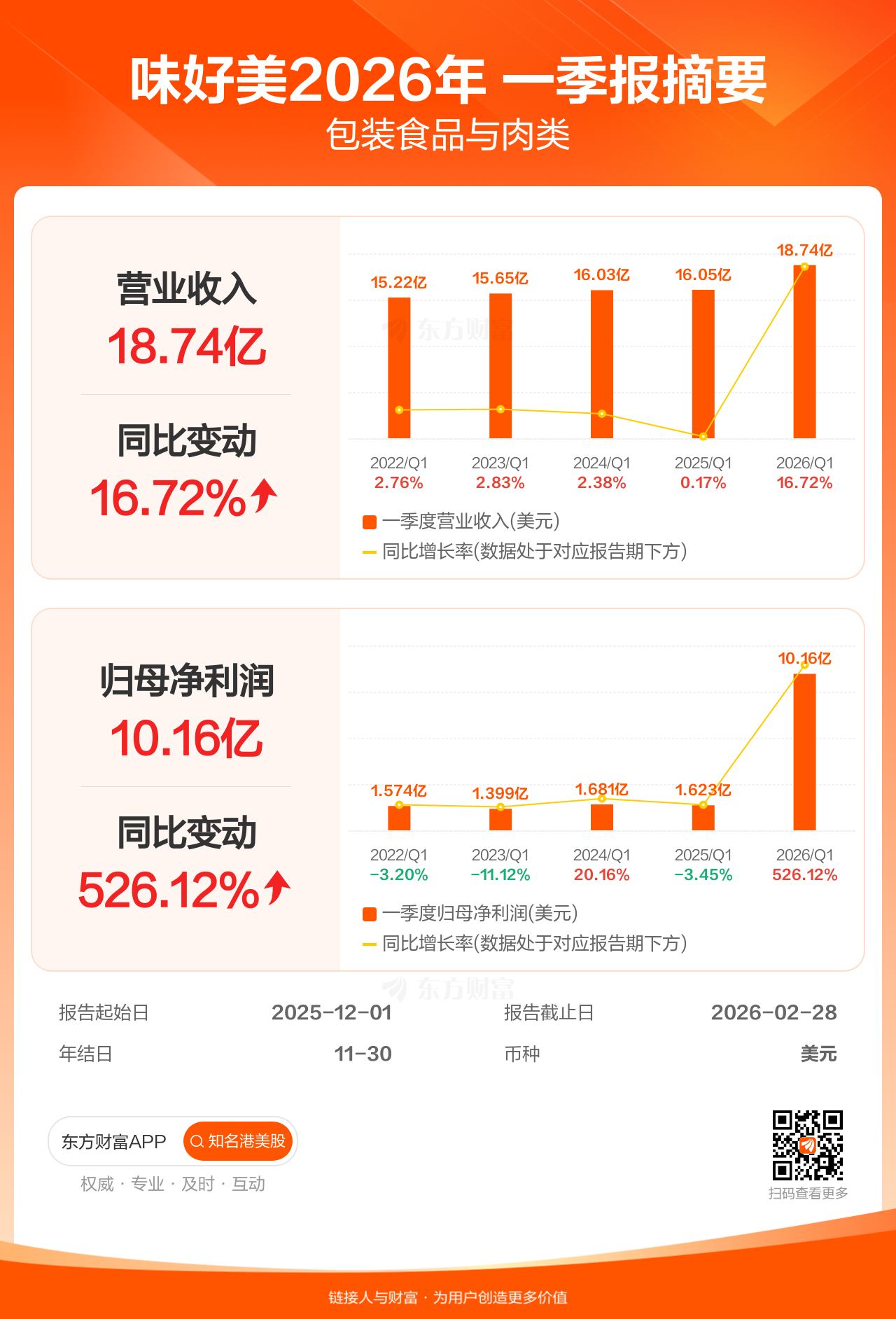 味好美3月31日发布一季报业绩,截至2026年2月28日的3个月内,该公司营业收入18.74亿美元,同比增长16.72%;公司权益持有人应占溢利(归母净利润)10.16亿美元,同比增长526.12%。