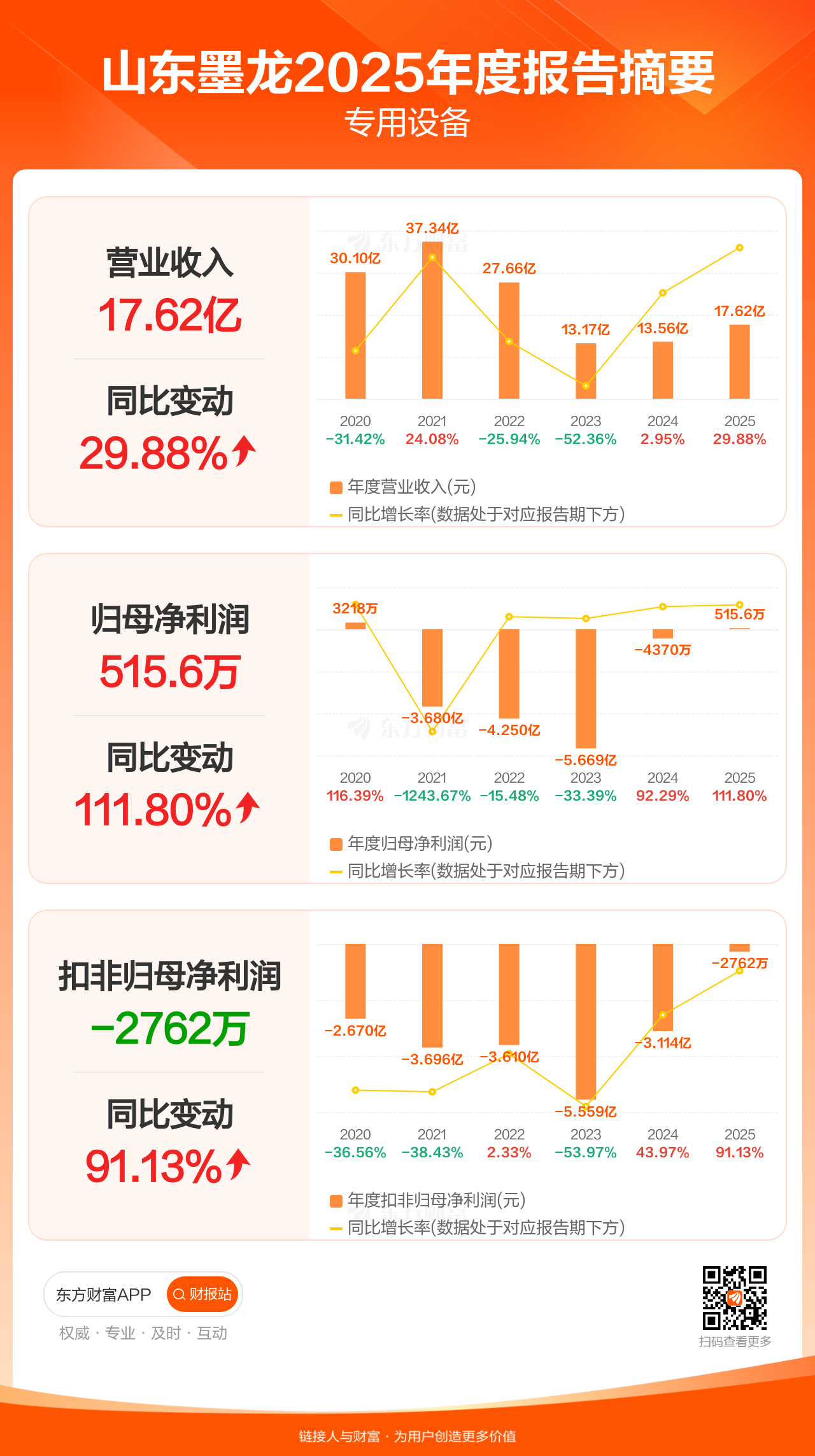 山东墨龙4月1日发布2025年年报显示,公司全年实现营业收入17.62亿元,同比增长29.88%;归母净利润515.56万元,同比增长111.80%;扣非归母净利润-2762.25万元。