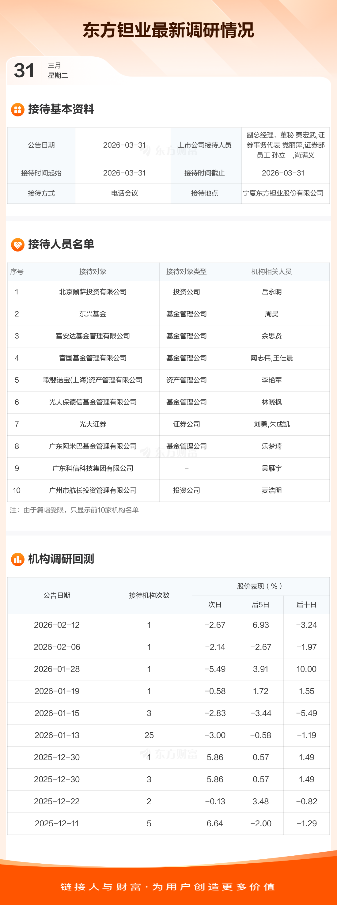 东方钽业3月31日公告称,3月31日接待北京鼎萨投资有限公司等80家机构调研。接待人员包括副总经理、董秘 秦宏武,证券事务代表 党丽萍,证券部员工 孙立喆,尚满义。