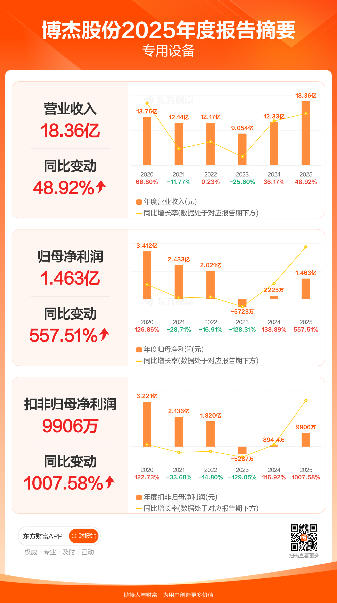 博杰股份4月1日发布2025年年报显示,公司全年实现营业收入18.36亿元,同比增长48.92%;归母净利润1.46亿元,同比增长557.51%;扣非归母净利润9905.85万元,同比增长1007.58%。