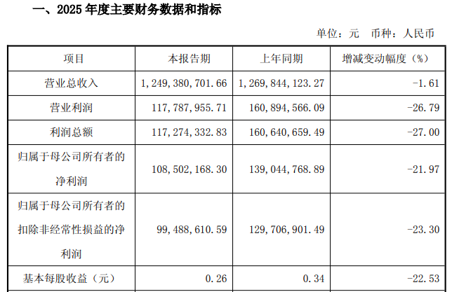 业绩方面,2025年度,公司实现营业收入12.49亿元,同比下降1.61%;归母净利润为1.09亿元,同比下降21.97%;扣非净利润为9948.86万元,同比下降23.30%。