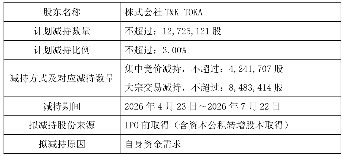 3月31日晚间,国内油墨头部企业杭华股份(688571)发布公告称,公司股东株式会社T&K TOKA(以下简称“TOKA”)因自身资金需求,计划于4月23日至7月22日通过集中竞价方式和大宗交易方式减持合计不超过1272.51万股,占公司总股本的比例不超过3%。
