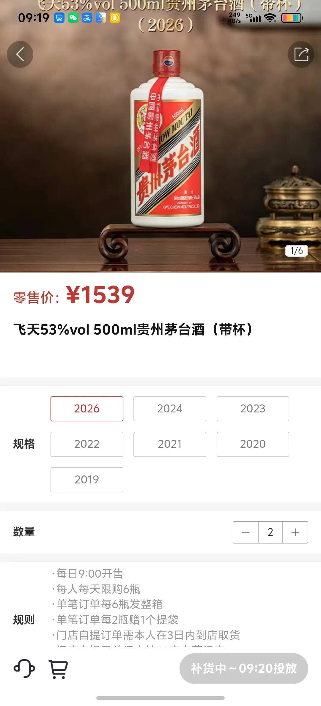 当日上午9点,笔者进入i茅台APP看到,飞天53%vol500ml贵州茅台酒价格已更新为1539元。除价格变化外,购酒流程与以往相比并无太多变化,依旧是选择产品、点击进入、选择数量、立即购买的流程。但消费者购酒的热情丝毫未减,大量消费者进入i茅台平台购买飞天茅台酒。从上午9点至9点半之间,平台虽每隔五分钟便进行一次补货,但每次补货后均迅速售罄。