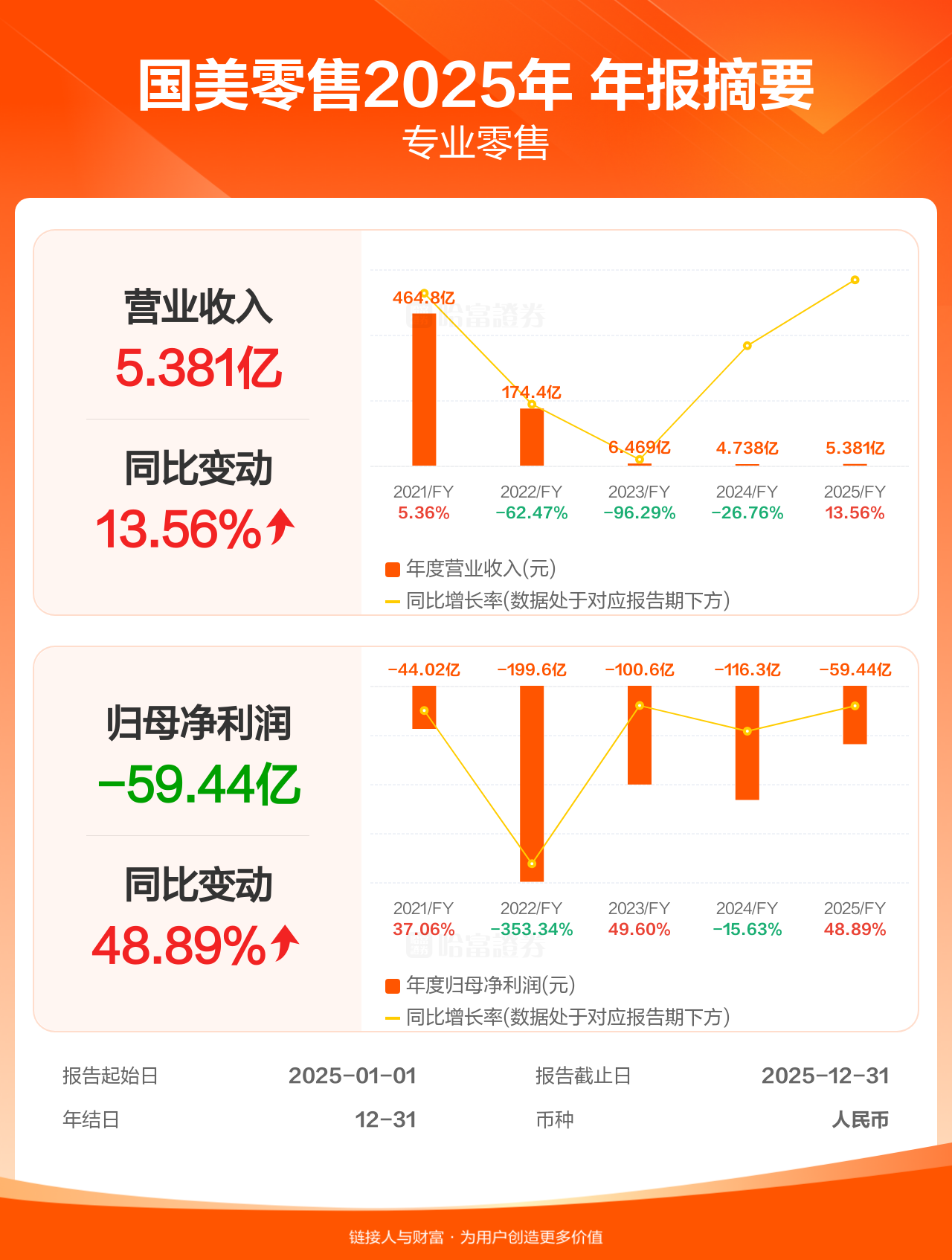 国美零售3月31日发布年报业绩,截至2025年12月31日的12个月内,该公司营业收入5.38亿人民币,同比增长13.56%;公司权益持有人应占溢利(归母净利润)-59.44亿人民币,上年同期-116.29亿人民币。