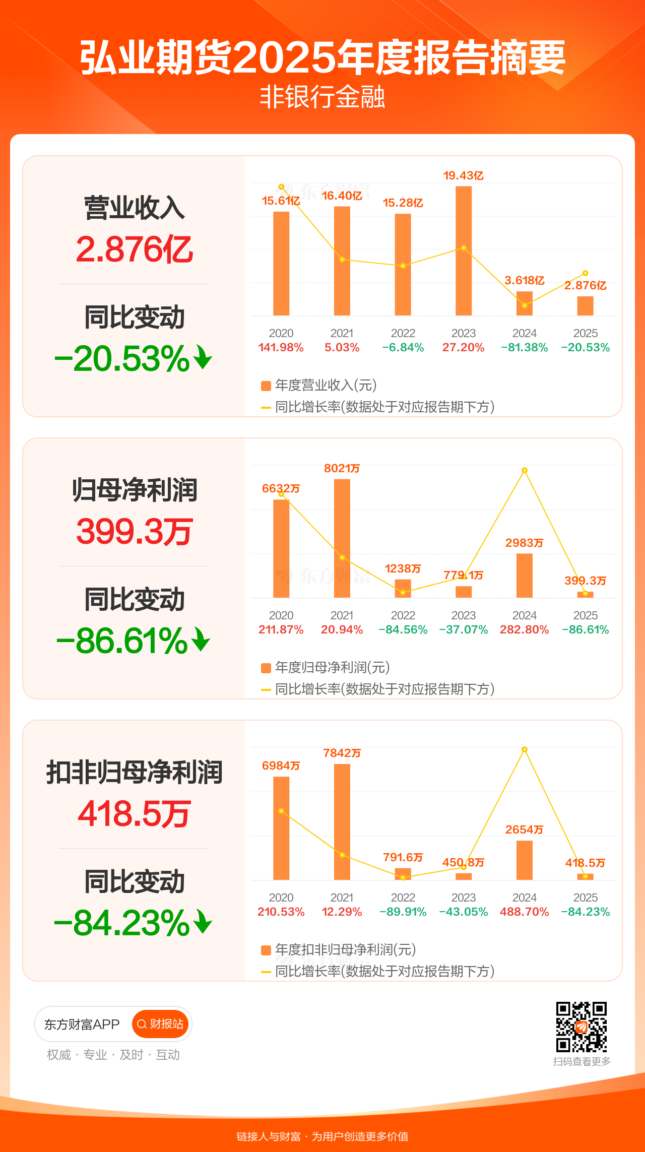 弘业期货4月1日发布2025年年报显示,公司全年实现营业收入2.88亿元,同比下滑20.53%;归母净利润399.27万元,同比下滑86.61%;扣非归母净利润418.48万元,同比下滑84.23%。