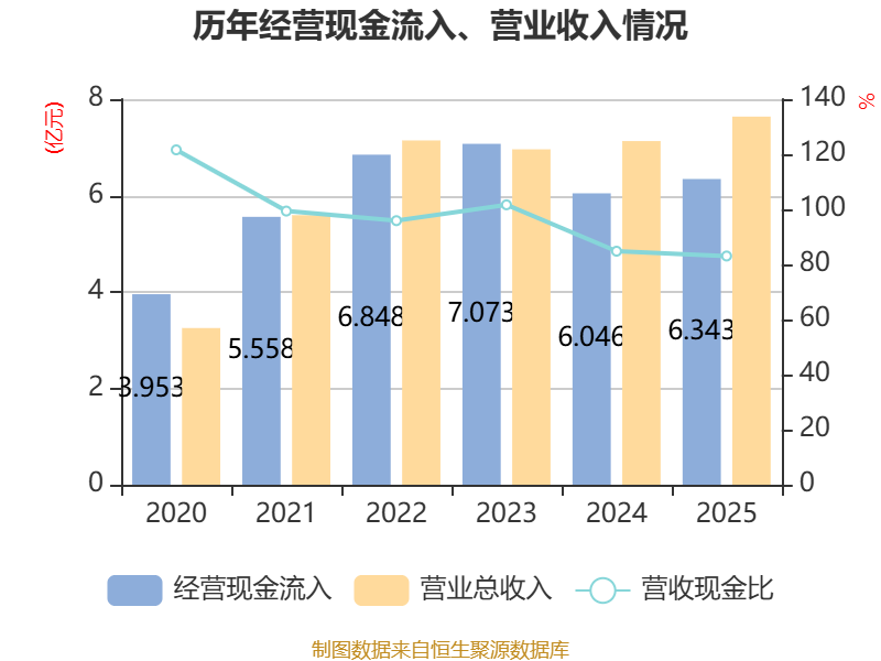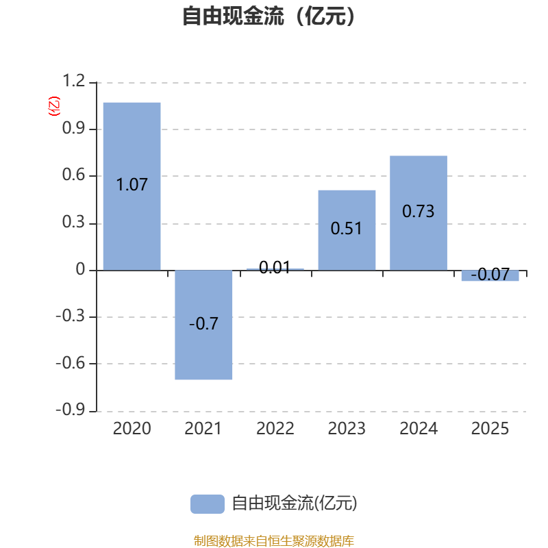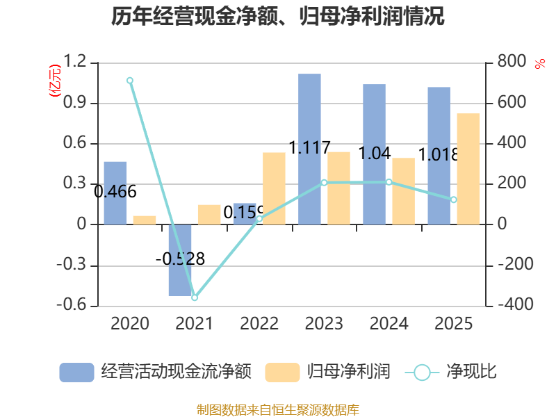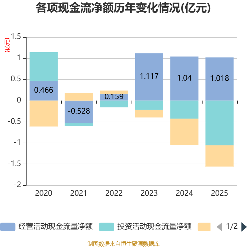 截至2025年,公司经营活动现金流净额为1.02亿元,同比下降2.09%;筹资活动现金流净额-5008.41万元,同比增加1243.89万元;投资活动现金流净额-1.06亿元,上年同期为-4262.22万元。
