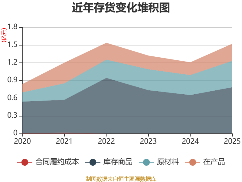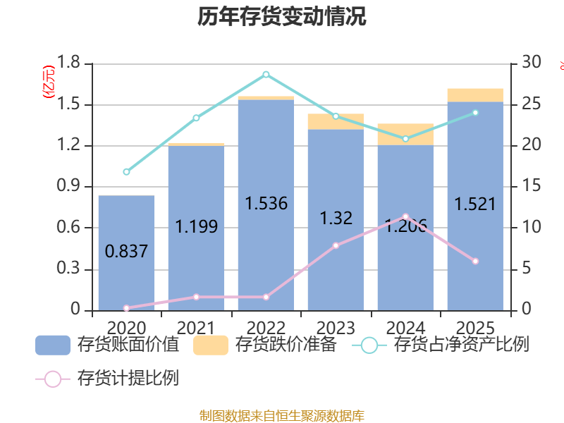 从存货变动来看,截至2025年末,公司存货账面价值为1.52亿元,占净资产的24.02%,较上年末增加3150.71万元。其中,存货跌价准备为963.62万元,计提比例为5.96%。
