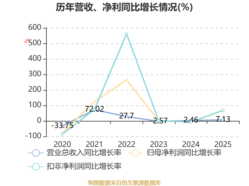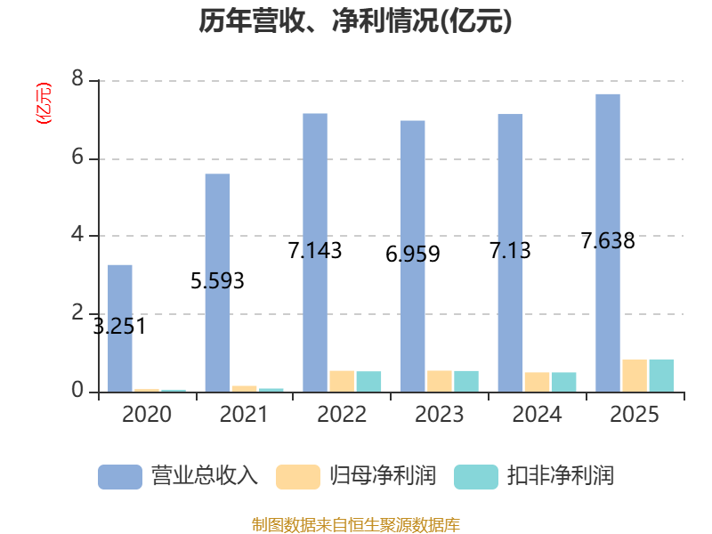中证智能财讯宏盛股份(603090)4月1日披露2025年年度报告。2025年,公司实现营业总收入7.64亿元,同比增长7.13%;归母净利润8238.53万元,同比增长66.91%;扣非净利润8252.17万元,同比增长67.55%;经营活动产生的现金流量净额为1.02亿元,同比下降2.09%;报告期内,宏盛股份基本每股收益为0.82元,加权平均净资产收益率为13.68%。公司2025年度分配预案为:拟向全体股东每10股派现3元(含税)。