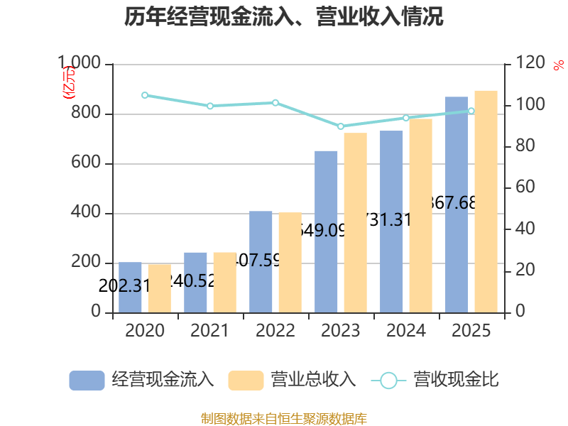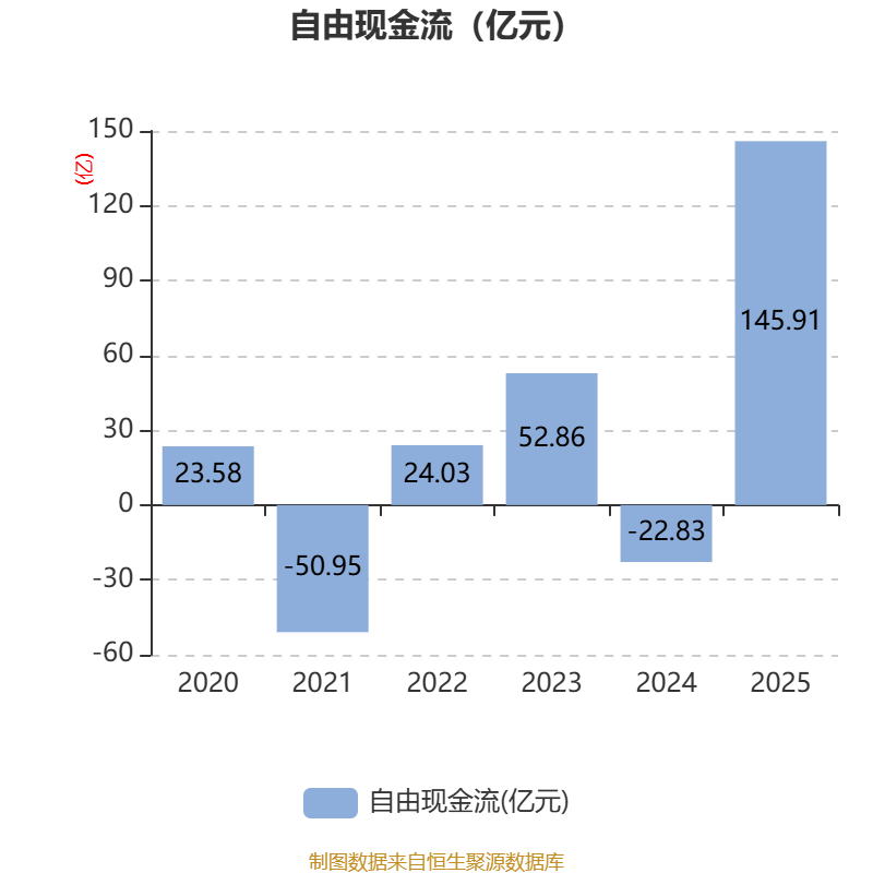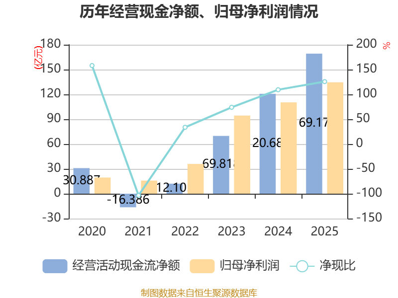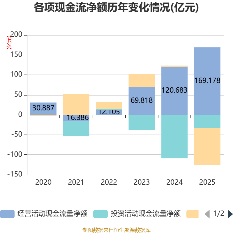 截至2025年,公司经营活动现金流净额为169.18亿元,同比增长40.18%;筹资活动现金流净额-92.94亿元,同比减少95.53亿元;投资活动现金流净额-32.71亿元,上年同期为-108.53亿元。