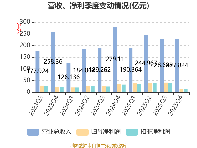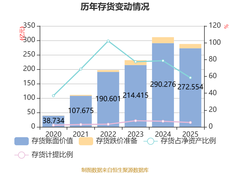 从存货变动来看,截至2025年末,公司存货账面价值为272.55亿元,占净资产的58.47%,较上年末减少17.72亿元。其中,存货跌价准备为14.94亿元,计提比例为5.2%。