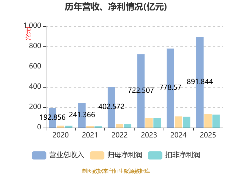 中证智能财讯阳光电源(300274)4月1日披露2025年年度报告。2025年,公司实现营业总收入891.84亿元,同比增长14.55%;归母净利润134.61亿元,同比增长21.97%;扣非净利润128.29亿元,同比增长19.98%;经营活动产生的现金流量净额为169.18亿元,同比增长40.18%;报告期内,阳光电源基本每股收益为6.55元,加权平均净资产收益率为31.26%。公司2025年度分配预案为:拟向全体股东每10股派现6.9元(含税)。
