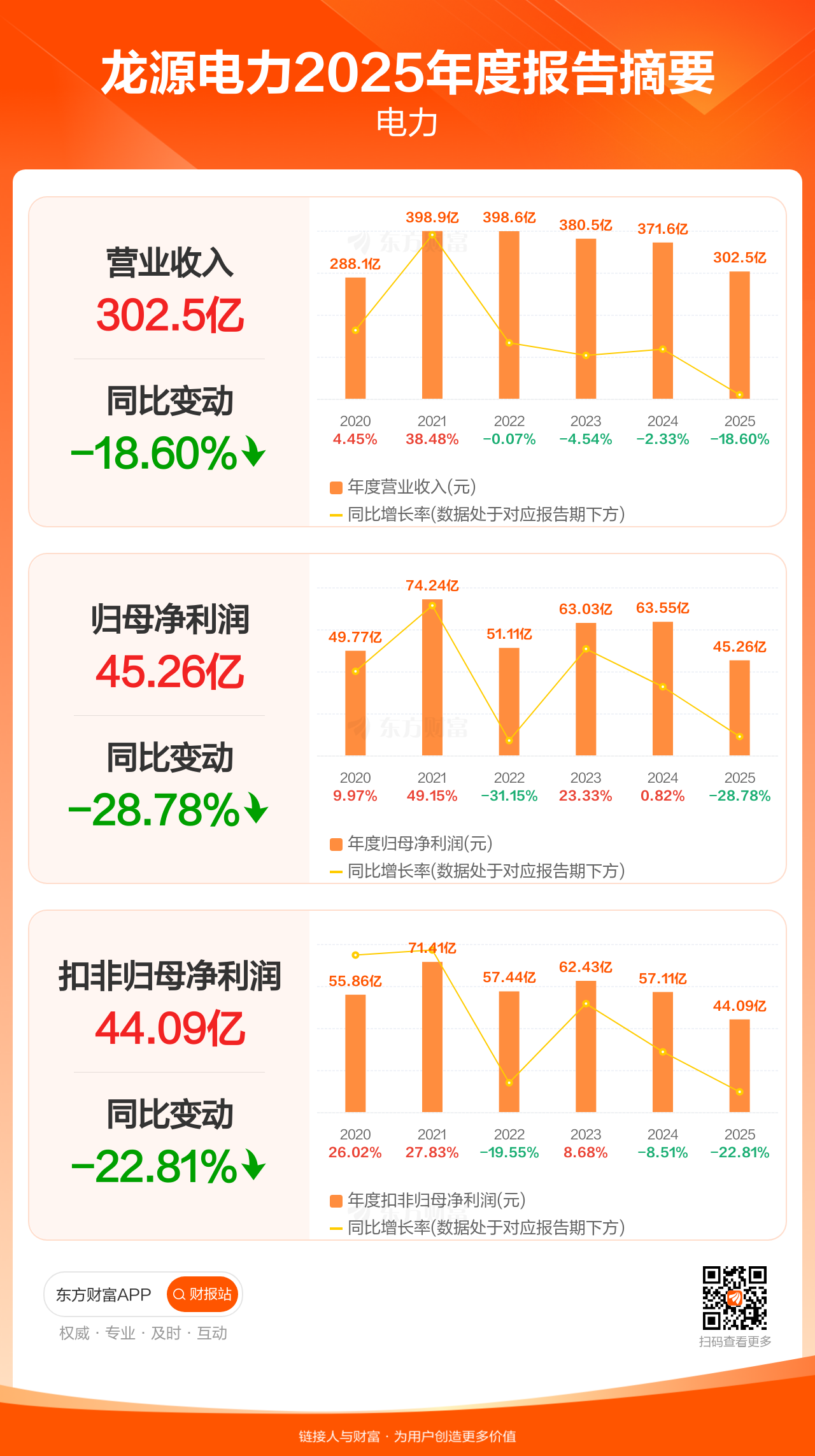 龙源电力4月1日发布2025年年报显示,公司全年实现营业收入302.53亿元,同比下滑18.60%;归母净利润45.26亿元,同比下滑28.78%;扣非归母净利润44.09亿元,同比下滑22.81%。