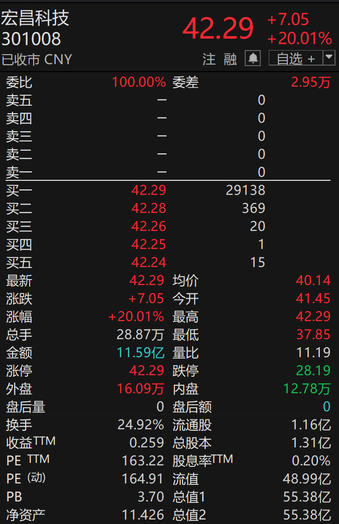 截至3月31日收盘,宏昌科技报42.29元/股,目前总市值为55.38亿元。