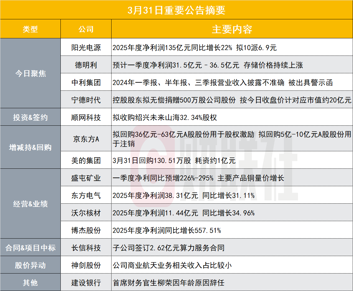 财联社3月31电,德明利(001309.SZ)公告称,预计2026年第一季度归属于上市公司股东的净利润为31.5亿元–36.5亿元,上年同期亏损6908.77万元。报告期内,在供应偏紧的背景下,行业景气度持续上行,存储价格持续上涨,公司依托前期充足的原材料战略储备,盈利能力持续改善,利润水平大幅提高。
