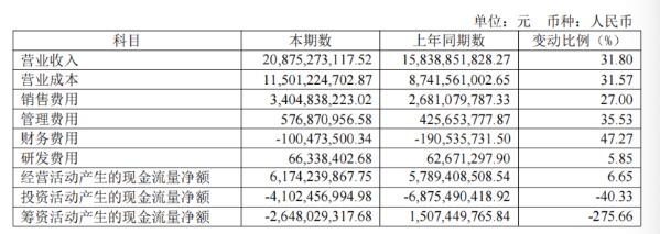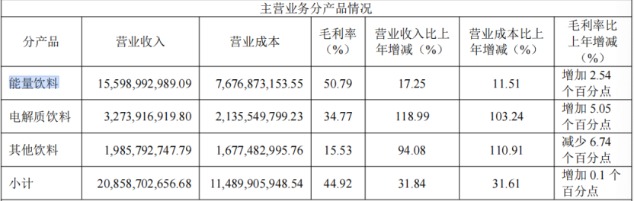 2025年,公司力推的电解质饮料“补水啦”全年实现营收32.74亿元,同比增长118.99%,占主营业务收入的比重由2024年的9.45%提升至2025年的15.70%;“其他饮料”的营业收入为19.86亿元,同比增长94.08%,其中,“果之茶”“东鹏大咖”等产品营收突破5亿元。