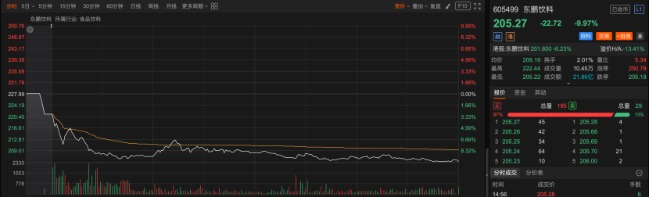 截至3月31日收盘,东鹏饮料A股报205.27元/股,下跌9.97%(跌停);港股报210.8港元/股,下跌6.23%,低开低走。