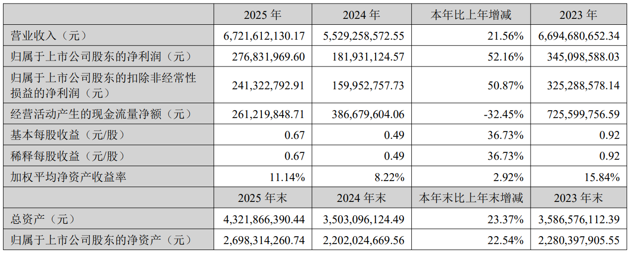 中证智能财讯吉宏股份(002803)4月1日披露2025年年度报告。2025年,公司实现营业总收入67.22亿元,同比增长21.56%;归母净利润2.77亿元,同比增长52.16%;扣非净利润2.41亿元,同比增长50.87%;经营活动产生的现金流量净额为2.61亿元,同比下降32.45%;报告期内,吉宏股份基本每股收益为0.67元,加权平均净资产收益率为11.14%。公司2025年度分配预案为:拟向全体股东每10股派现1.8元(含税)。