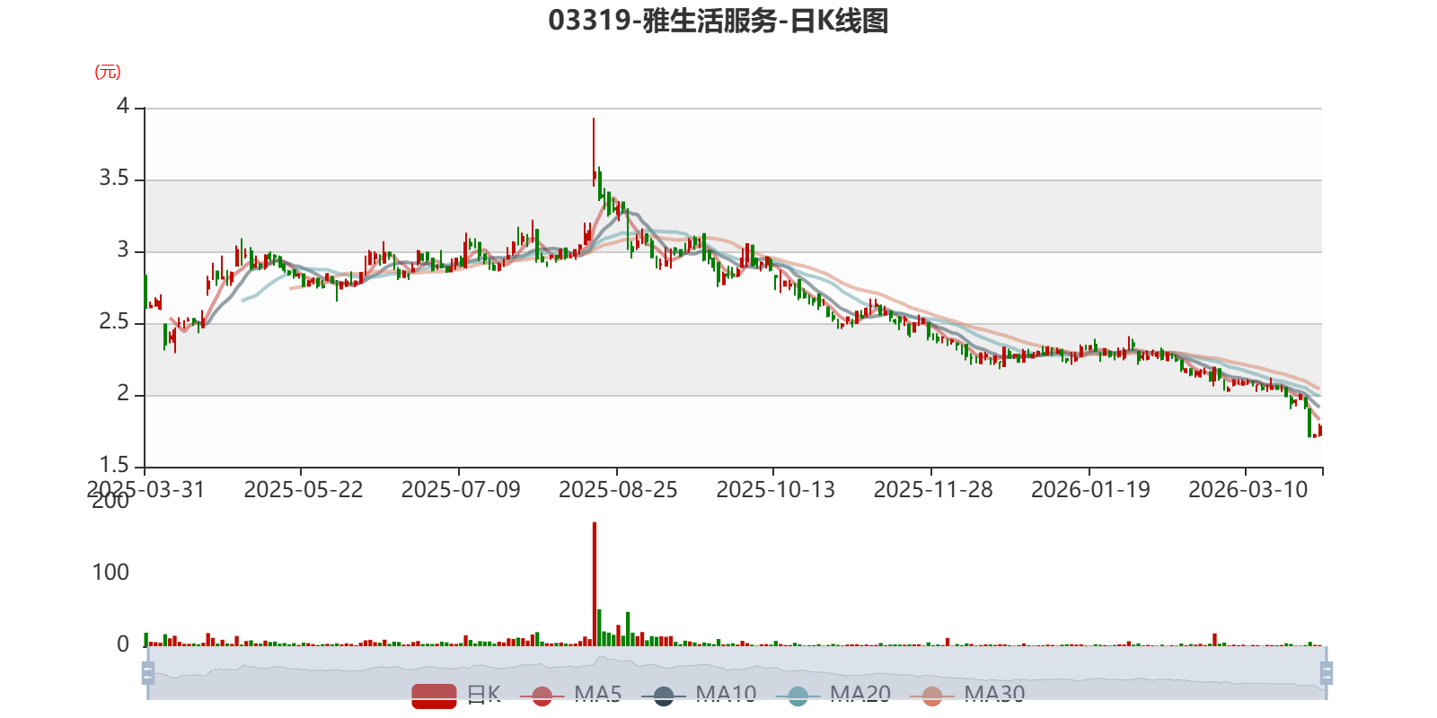 以3月31日收盘价计算,雅生活服务目前市净率(TTM)约0.24倍,市销率(TTM)约0.17倍。