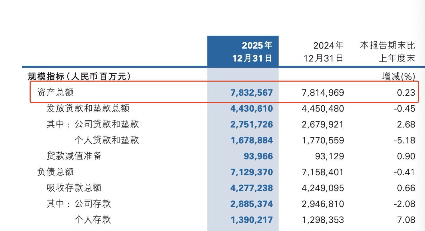 年报数据显示,截至2025年末民生银行总资产7.83万亿,同比微增0.23%。这一增幅在22家已披露年报的上市银行中是最低的。