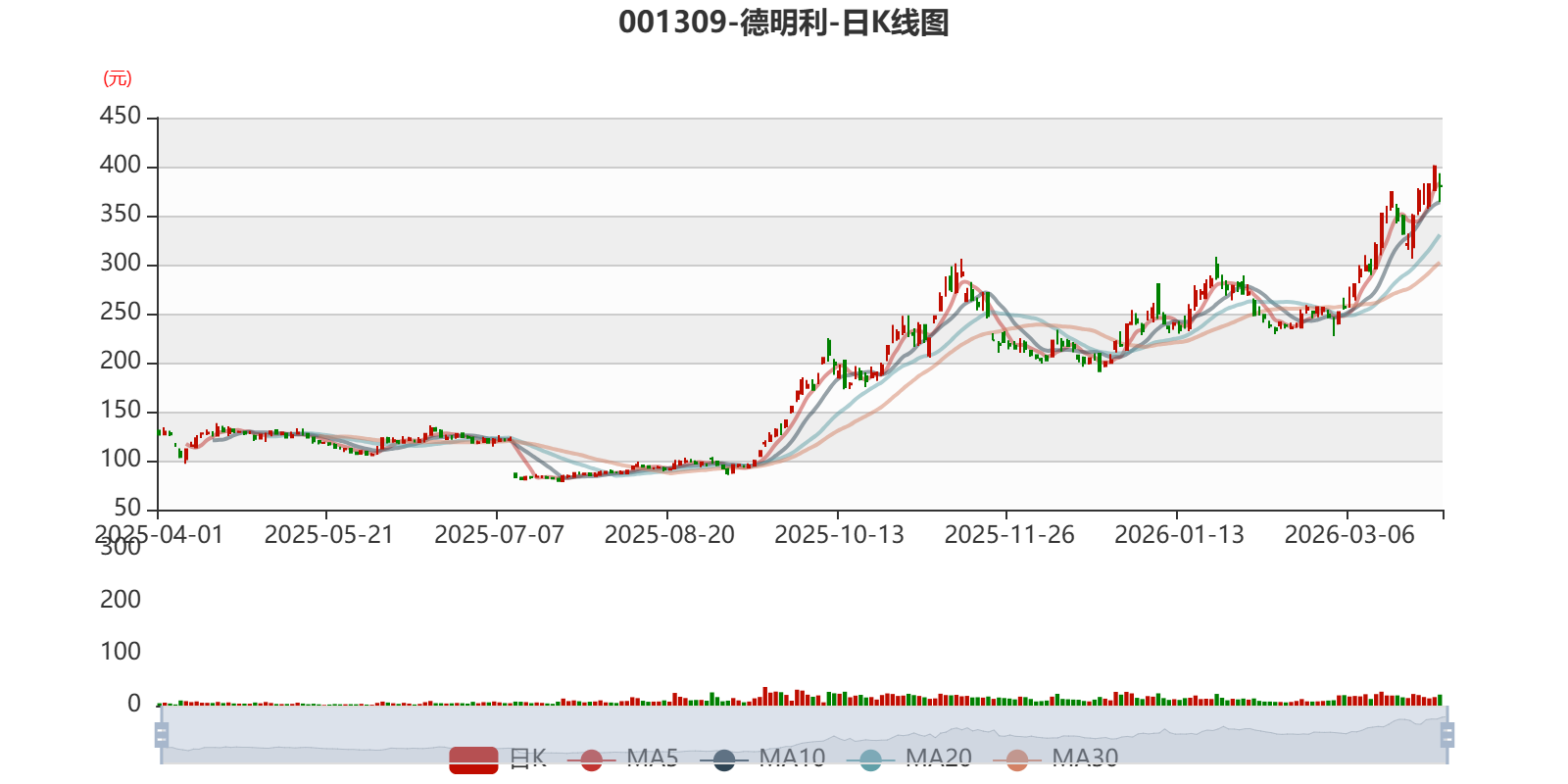 中证智能财讯德明利(001309)3月31日晚间披露业绩预告,预计2026年一季度实现营业收入73亿元至78亿元,同比增长483.05%-522.98%;归母净利润31.5亿元至36.5亿元,上年同期亏损6908.77万元;扣非净利润预计31.4亿元至36.4亿元,上年同期亏损7495.86万元;基本每股收益14.01元/股-16.23元/股。以3月31日收盘价计算,德明利目前市盈率(TTM)约为19.56倍-22.07倍,市净率(LF)约26.37倍,市销率(TTM)约5.05倍。