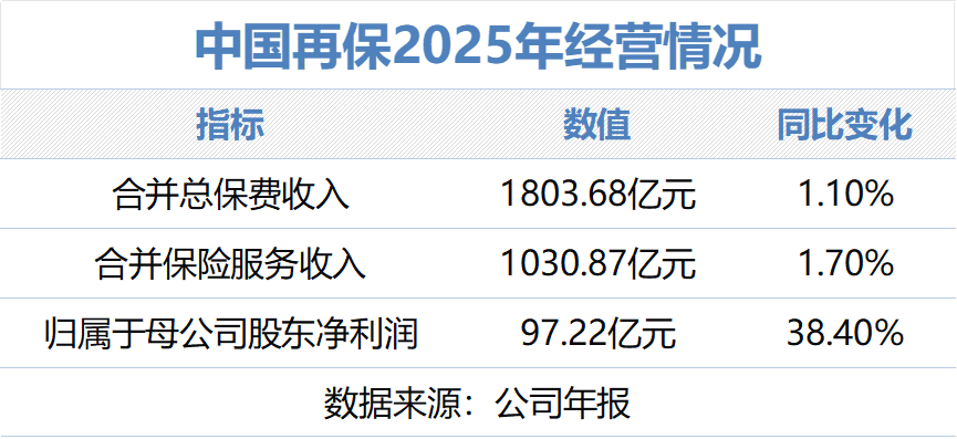 按可比口径计算,中国再保合并总保费收入、归属于母公司股东净利润均创历史新高:合并总保费收入1803.68亿元,同比增长1.1%;合并保险服务收入1030.87亿元,同比增长1.7%;归属于母公司股东净利润97.22亿元,同比增长38.4%。