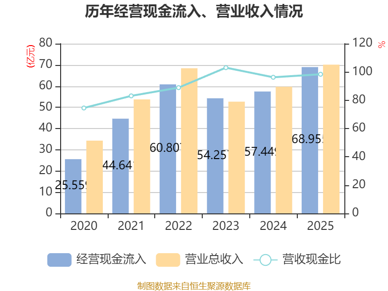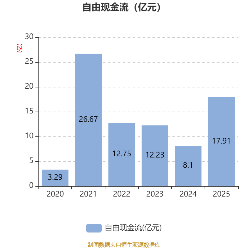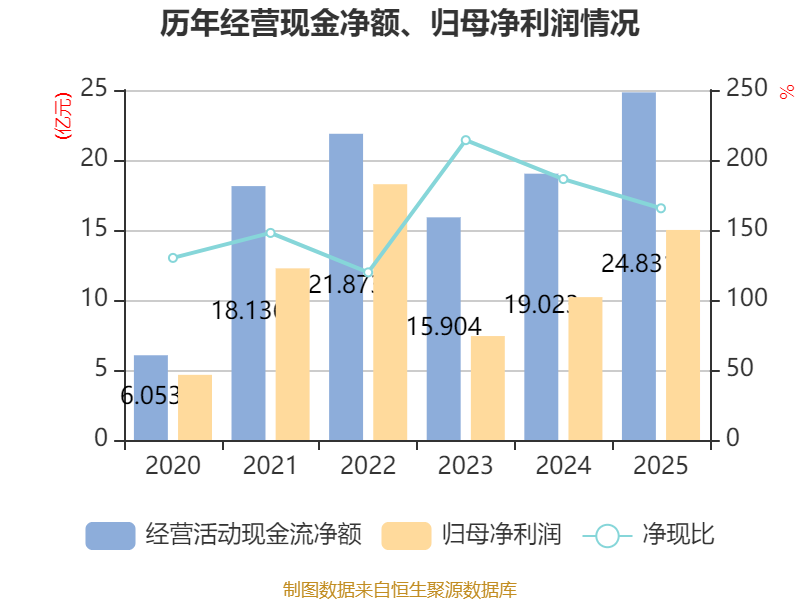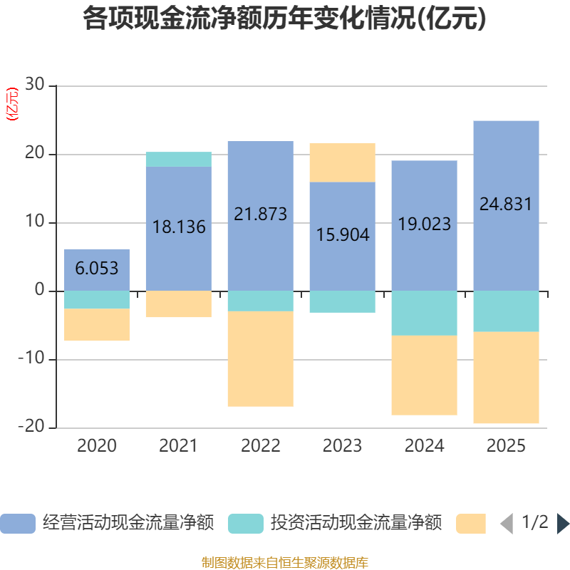 截至2025年,公司经营活动现金流净额为24.83亿元,同比增长30.53%;筹资活动现金流净额-13.39亿元,同比减少1.74亿元;投资活动现金流净额-6.01亿元,上年同期为-6.55亿元。