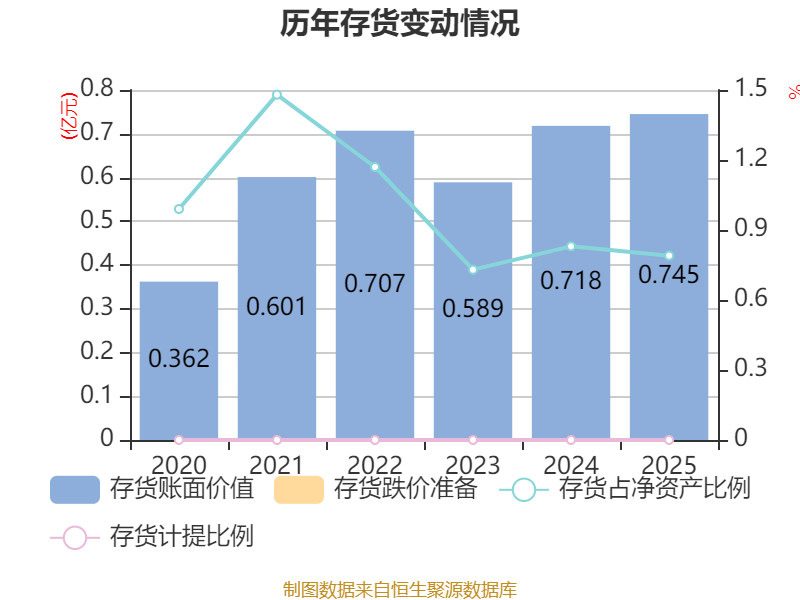 从存货变动来看,截至2025年末,公司存货账面价值为7453.84万元,占净资产的0.79%,较上年末增加276.04万元。公司本期没有计提存货跌价准备。