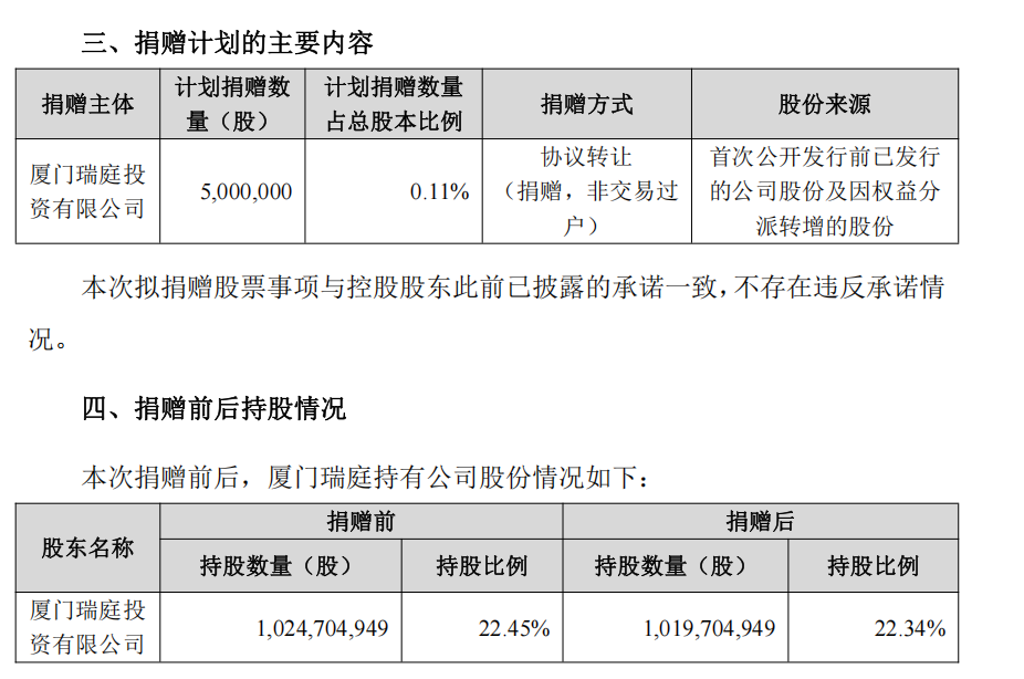 据公告,厦门瑞庭此次无偿捐赠其持有的宁德时代500万股A股无限售流通股,占公司总股本的0.11%。截至公告日,厦门瑞庭持有宁德时代10.24亿股A股股份,占公司总股本的22.45%;捐赠完成后,其持股比例将降至22.34%。