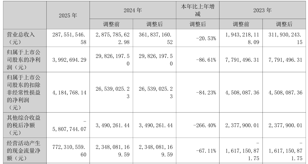 3月31日晚间,弘业期货(001236)发布2025年年度报告,公司全年实现营业收入2.88亿元,同比下降20.53%;归母净利润为399.27万元,同比下降86.61%;扣非净利润为418.48万元,同比下降84.23%。