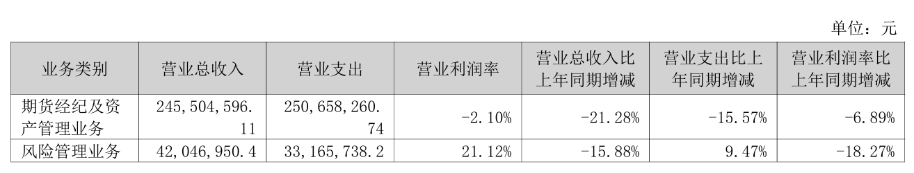 分业务拆解,公司两大“顶梁柱”业务均亮起红灯。贡献85.38%营收的期货经纪及资产管理业务,收入同比下滑逾两成,营业利润率亦失守近7个百分点;另一大收入来源风险管理业务同样“寒气逼人”,收入降幅为15.88%,营业利润率更是下滑18.27个百分点。