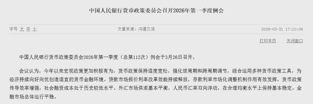 中国人民银行3月31日消息,中国人民银行货币政策委员会2026年第一季度(总第112次)例会于3月26日召开。会议建议,发挥增量政策和存量政策集成效应,综合运用多种工具,加强货币政策调控,根据国内外经济金融形势和金融市场运行情况,把握好政策实施的力度、节奏和时机。