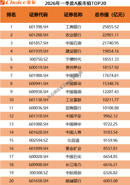 截至一季度末,A股市场共11只个股总市值超过1万亿元,工商银行市值2.59万亿元,为A股市值最大公司;农业银行、中国石油市值也都超过2万亿元,建设银行以1.99万亿元的市值位居第四;宁德时代、贵州茅台市值超过1.8万亿元。