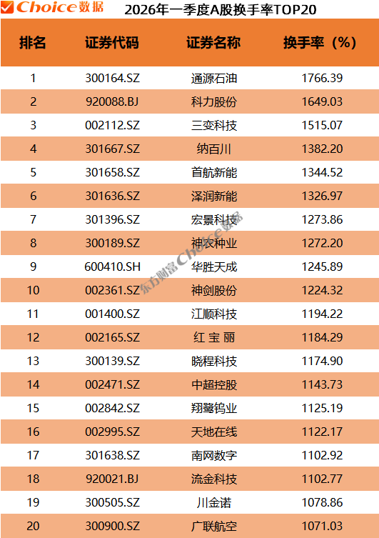 一季度,共3只个股换手率超过1500%,通源石油排名第一,换手率高达1766.39%。