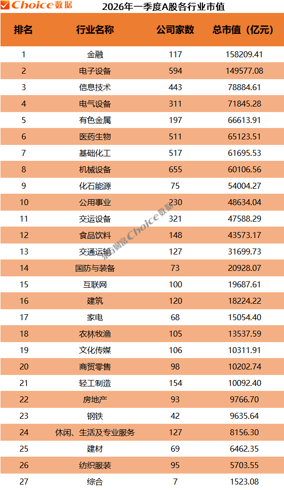 截至一季度末,A股市场市值最大的行业仍是金融,行业总市值逼近16万亿元;电子设备行业总市值14.96万亿元,位居第二;信息技术、电气设备、有色金属、化石能源、医药生物、基础化工等行业总市值均在5万亿元以上。